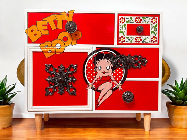 Discover a truly unique piece of art for your home with our Betty Boop inspired hand-painted jewellery box. This one-of-a-kind cabinet features intricate details hand-painted by Nancy at Art By Nancy. With multiple drawers and a chest of drawers design, this furniture piece is not only a stunning decorative item but also a functional storage solution for your jewelry or small trinkets. Add a touch of whimsy and charm to your space with this beautiful and exclusive piece that is sure to be a conversation starter.